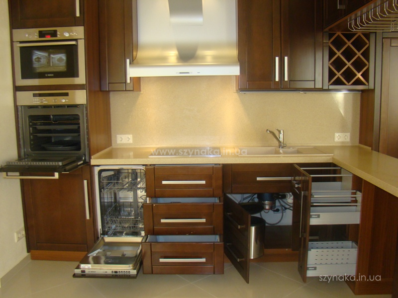 Кухни в теплом классическом стиле отличаются привлекательными декоративными деталями, имеют яркий естественный оттенок древесины. В магазинах доступны готовые проекты кухни с учетом не только разного рода кухонных шкафов, но и бытовой техники. Вы также можете самостоятельно разработать набор шкафов, полок и стеллажей. Самыми популярными материалами для кухни являются МДФ и ДСП, оба варианта позволяют изготовить качественный продукт.