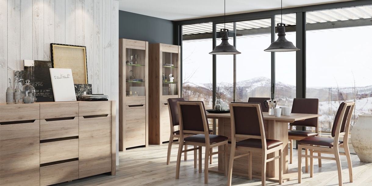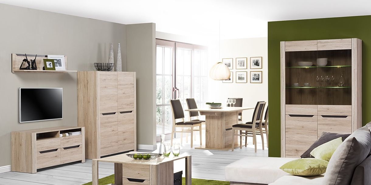 Польская мебель Szynaka DESJO представляет собой уникальную коллекцию с ярко выраженным рисунком дерева, подчеркнутым древесными царапинками и лучами. Оригинальные углубленные ручки коричневого оттенка создают 3D-эффект. Витрины оснащены закаленным стеклом Antisol и по желанию комплектуются подсветкой. Эффектная комбинация застекленных и глухих фасадов придает мебели Шинака Дезжо неповторимый стиль, делая ее украшением любого интерьера.