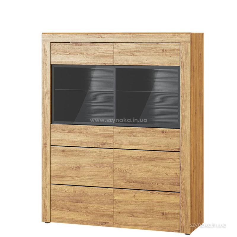 KAMA 15 SZYNAKA Витрина двухдверная модульной системы Кама ШИНАКА. За дверями со вставками из прозрачного закаленного стекла расположены два отделения со стеклянной и тремя деревянными полками в каждом. Задние стенки – рифленые, черного цвета. Витрина дополнительно комплектуется верхней подсветкой 2-L-BC-2-0000-01 или подсветкой полок 3-L-BN-2-0000-01 на выбор. Оснащена системой тихого закрытия дверей.