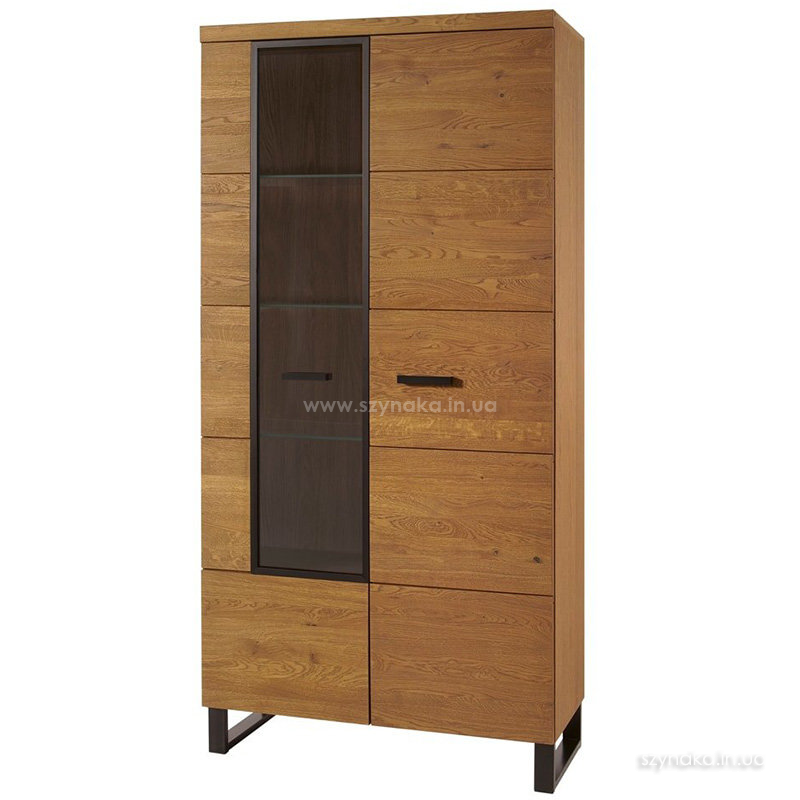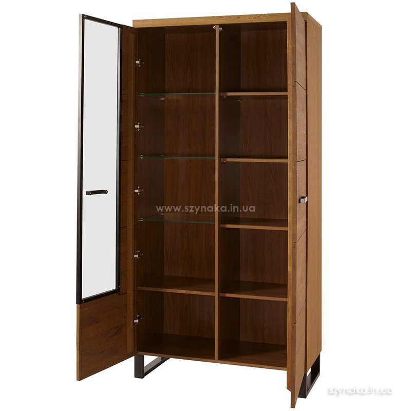 PRATTO 12 SZYNAKA Витрина двухдверная модульной системы Пратто ШИНАКА. За левой дверью со вставкой из прозрачного закаленного стекла в черной алюминиевой раме расположены четыре полки, в том числе три стеклянные. За правой дверью установлены четыре деревянные полки. Дополнительно витрина комплектуется подсветкой 3-L-BN-3-0000-01. Применяется система тихого закрытия дверей.