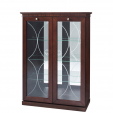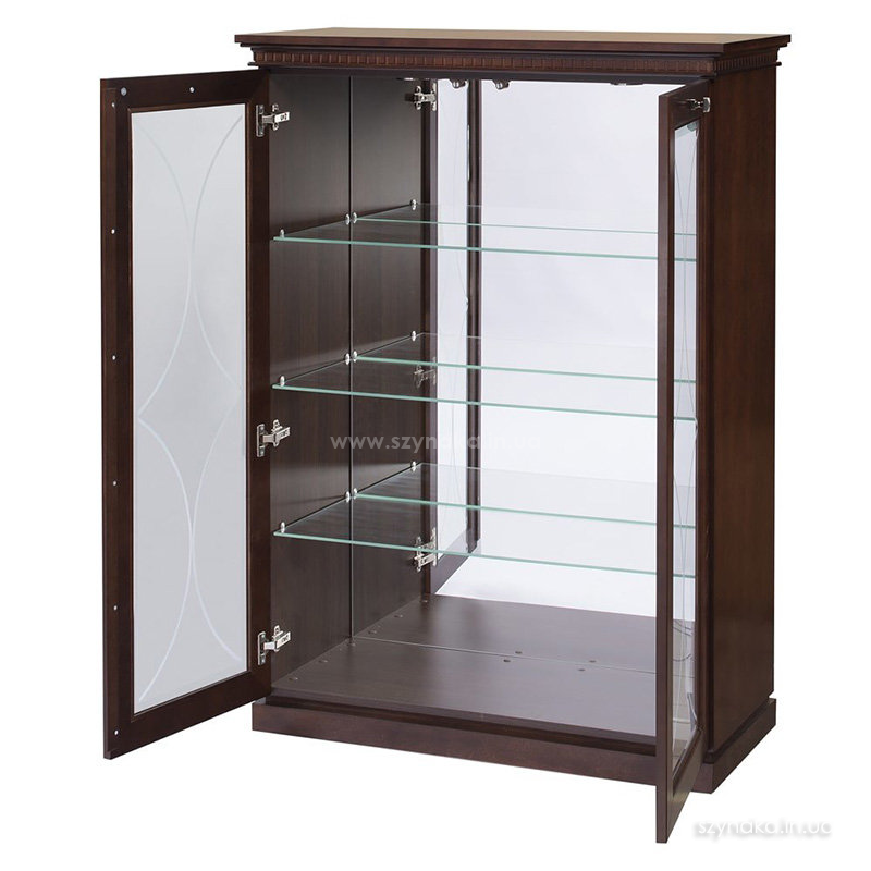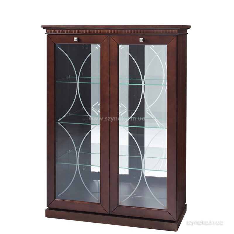 GRENADA 15 SZYNAKA Витрина двухдверная модульной системы Гренада ШИНАКА. Две двери оснащены прозрачным стеклом с рисунком в виде полукруглых линий. Внутри расположены две стекянные полки. На задней стенке размещено зеркало. Самая верхняя часть фасада имеет оригинальный резной узор. Витрина дополнительно комплектуется подсветкой 2-L-BC-2-0000-01. Применяется система тихого закрытия дверей.