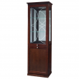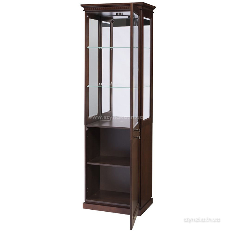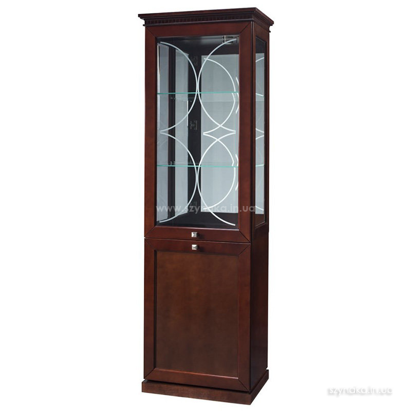GRENADA 11 SZYNAKA Витрина правая двухдверная модульной системы Гренада ШИНАКА. Открывается в правую сторону. Верхняя дверь оснащена прозрачным стеклом с рисунком в виде полукруглых линий. Внутри расположены две стекянные полки. На задней стенке размещено зеркало. Боковые стенки остеклены. В нижнем отделении установлена одна деревянная полка. Самая верхняя часть фасада имеет оригинальный резной узор. Витрина дополнительно комплектуется подсветкой 2-L-BC-1-0000-01. Применяется система тихого закрытия дверей.