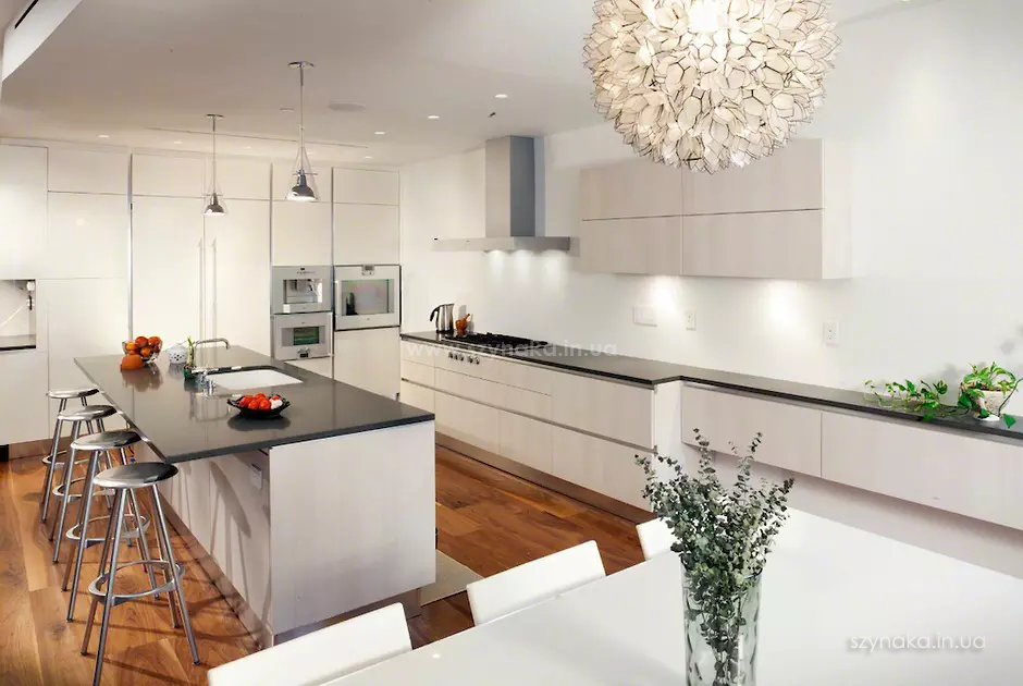 Помните, что основное освещение кухни имеет задачу практичную. Однако, важен также дизайн. Светильники для кухни могут бросаться в глаза, или аккуратно подчеркнут стиль аранжации. Выбор очень большой, и мы с легкостью подберем освещение для кухни для ее характера. Интересным решением является, например, белый подвесной светильник.