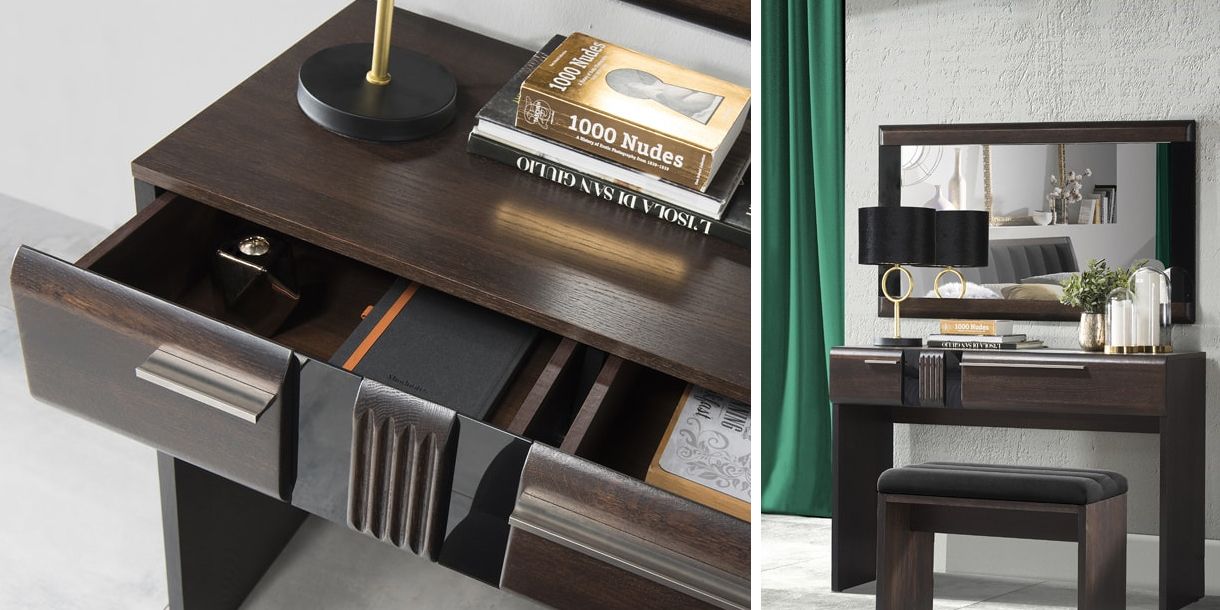 Данная коллекция представлена в цвете дуб шоколадный (есть еще вариант дуб античный – более светлый вариант), так же для мебели Порти можно докупить столовый стол Меркури – он так же доступный в этих цветах.