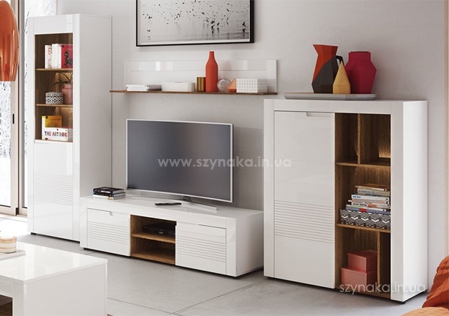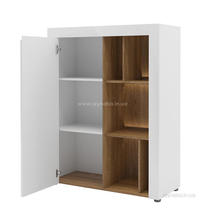 BELFORT 44 SZYNAKA Стеллаж однодверный модульной системы Белфорт ШИНАКА с пятью открытыми нишами. За дверцей расположены две полки. Стеллаж оснащен подсветкой и системой тихого закрытия дверей.