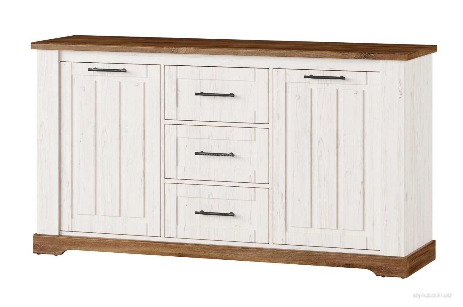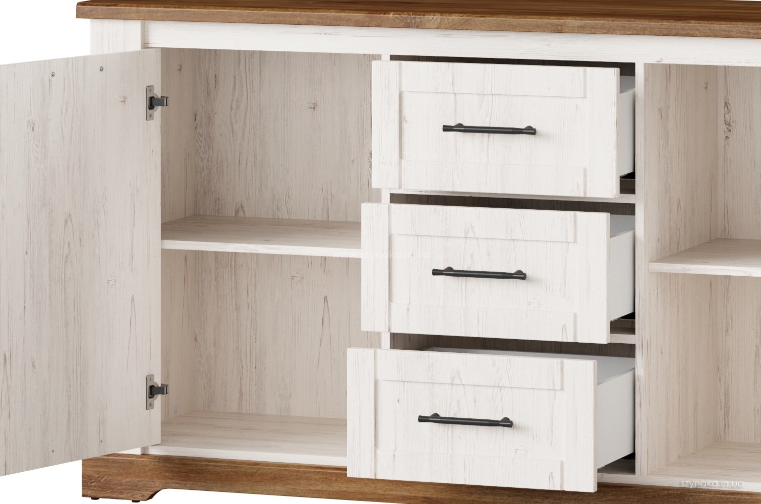 COUNTRY 45 SZYNAKA Комод двухдверный модульной системы Кантри ШИНАКА с тремя выдвижными ящиками. За каждой дверцей расположено по одной полке. Комод оснащен системой тихого закрытия дверей и ящиков.