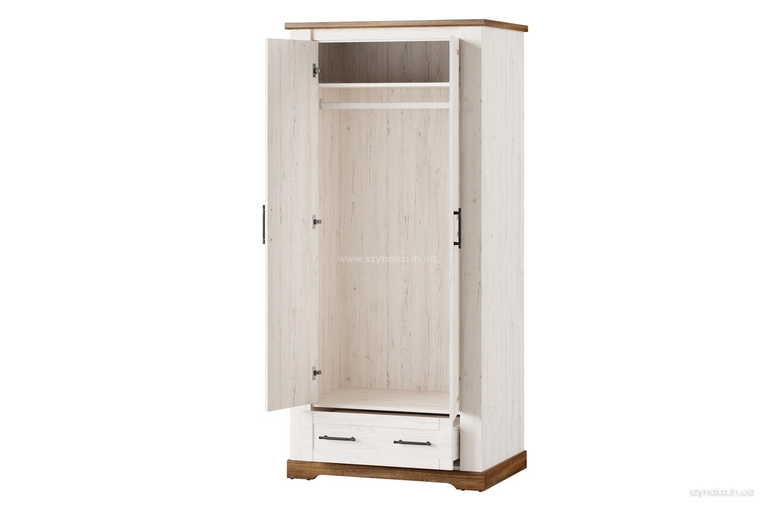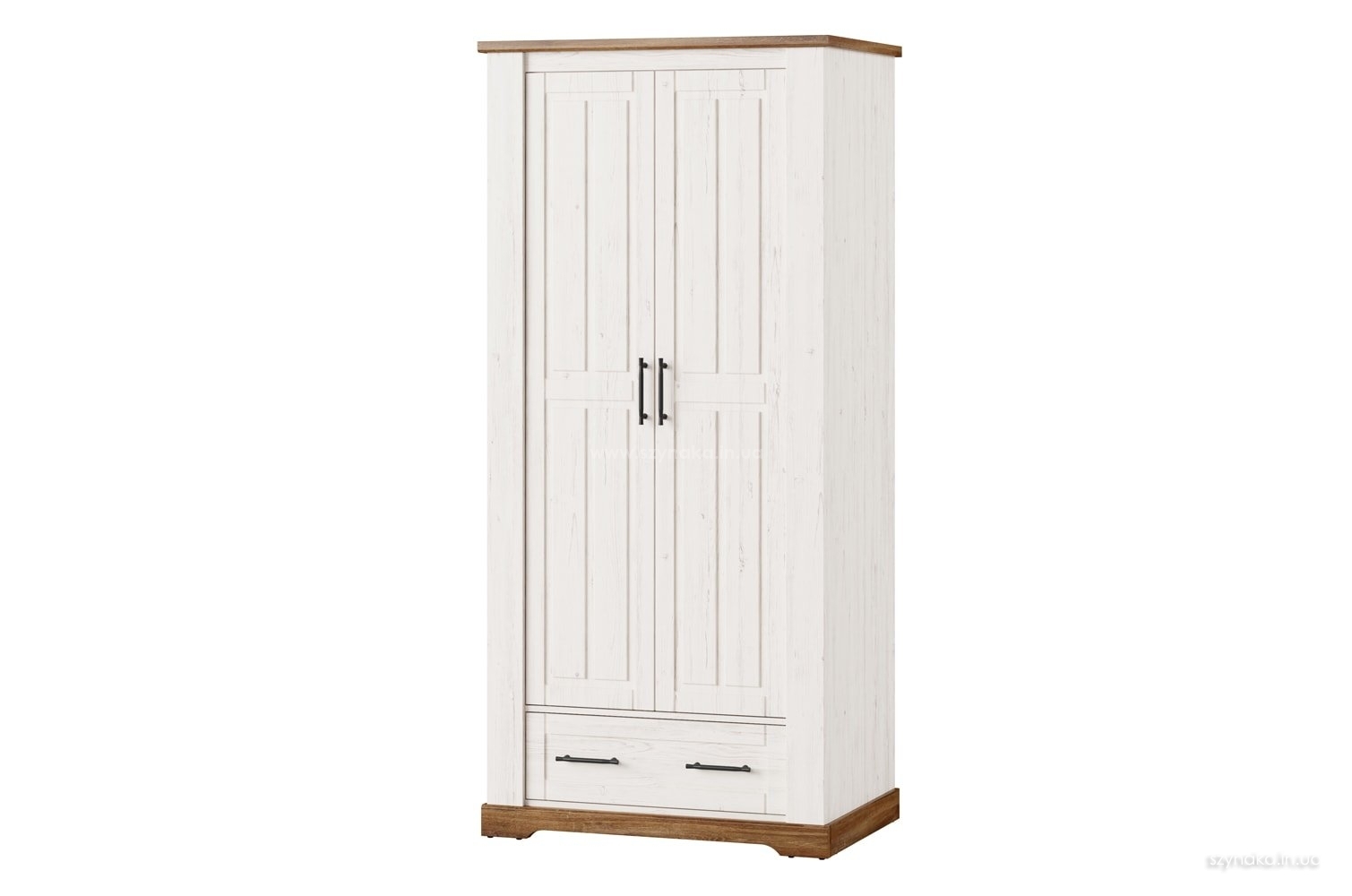 COUNTRY 70 SZYNAKA Шкаф двухдверный платяной модульной системы Кантри ШИНАКА с выдвижным ящиком. За двумя распашными дверцами расположена полка и штанга для вешалок. Шкаф оснащен системой тихого закрытия дверей и ящика.