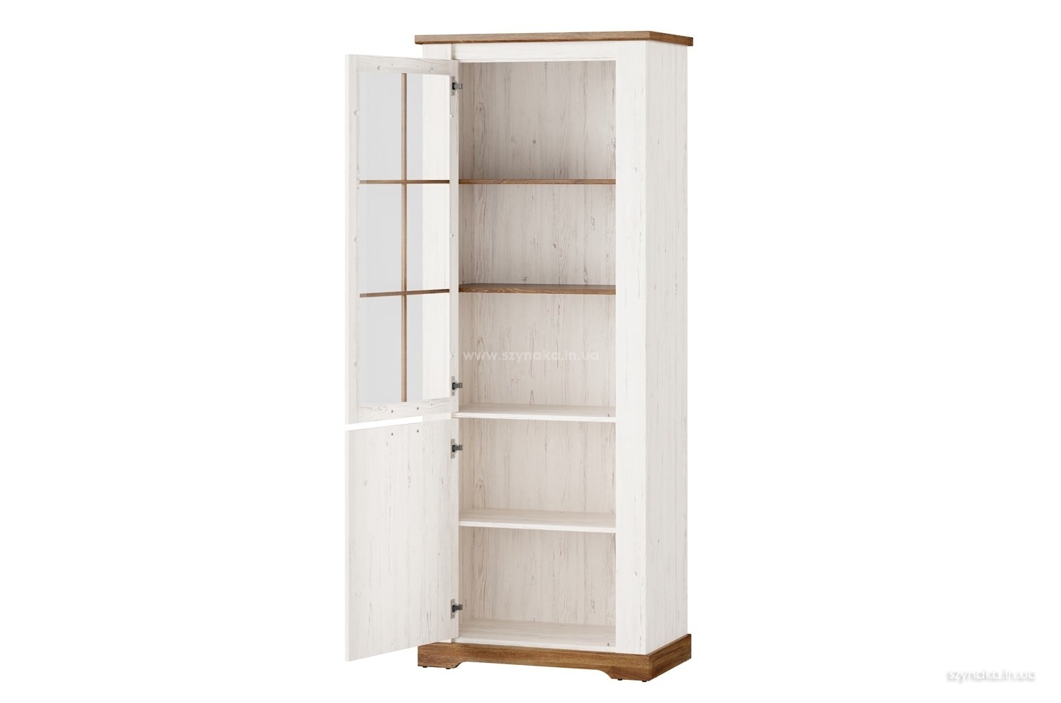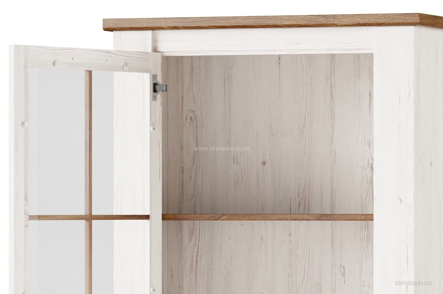 COUNTRY 10 SZYNAKA Витрина двухдверная модульной системы Кантри ШИНАКА. За верхней дверцей с прозрачным закаленным стеклом расположены две полки, которые можно дополнить подсветкой 3-L-BZ-2-0030-01. В нижнем отделении установлена одна полка. Витрина оснащена системой тихого закрытия дверей. В зависимости от сборки может быть левосторонней (петли слева) или правосторонней (петли справа).