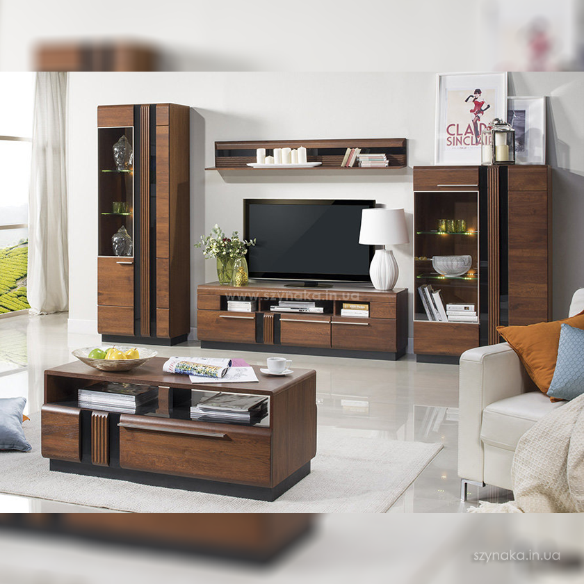 PORTI 10 SZYNAKA Витрина левая двухдверная модульной системы Порти ШИНАКА с двумя стеклянными полками за левой дверцей. В центральной части фасада расположена фрезерованная деревянная часть с окантовкой из черного закаленного стекла. Дополнительно витрина комплектуется подсветкой 3-L-BC-2-0100-01 , 3-L-BC-2-0400-02 или 2-L-BC-1-0000-01