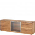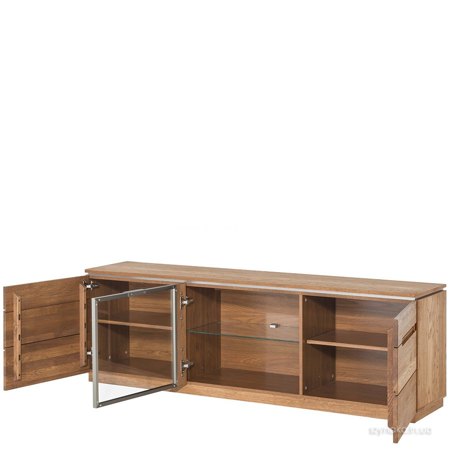 MONTENEGRO 26 SZYNAKA Буфет трехдверный модульной системы Монтенегро ШИНАКА. Декорирован горизонтальной металлической вставкой. За центральной дверью, оснащенной прозрачным закаленным стеклом в стальной раме, расположена одна стеклянная полка. В боковых отделениях – по одной деревянной полки. Дополнительно буфет комплектуется подсветкой 2-L-BC-1-0000-01 или 3-L-BN-1-0000-01 на выбор. Применяется система тихого закрытия дверей.