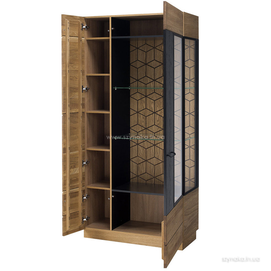 MOSAIC 12 SZYNAKA Витрина двухдверная модульной системы Мозаик ШИНАКА. Правая дверь и правая стенка оснащены закаленным стеклом в алюминиевой раме. Внутри расположены четыре полки, в том числе две стеклянные, которые можно дополнить подсветкой 3-L-BN-2-0000-01 , 3-L-BC-2-0100-01 или 3-L-BC-2-0400-02 на выбор. Задняя стенка декорирована оригинальным геометрическим узором. В левом отделении установлено пять полок. Витрина оснащена системой тихого закрытия дверей.