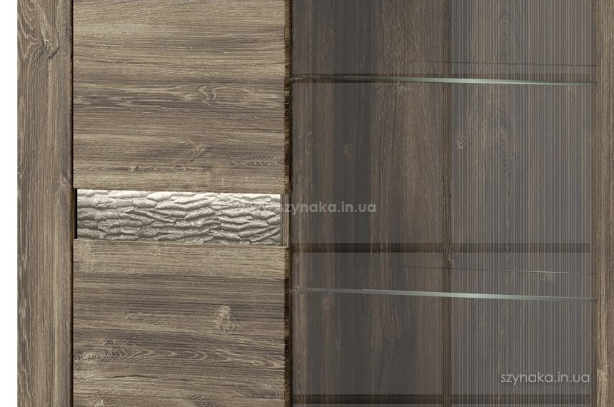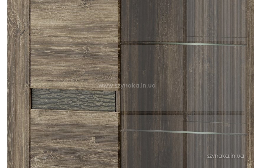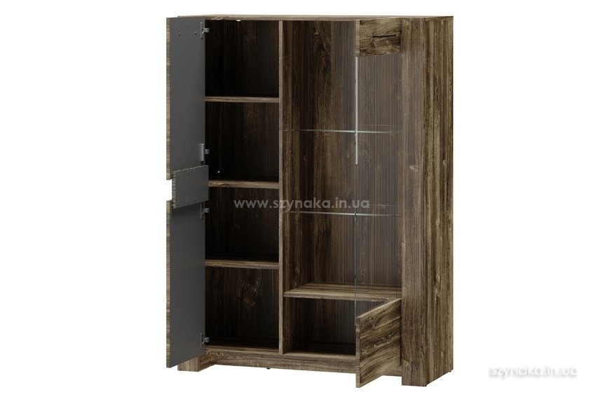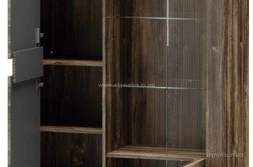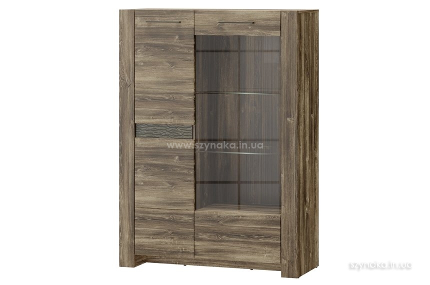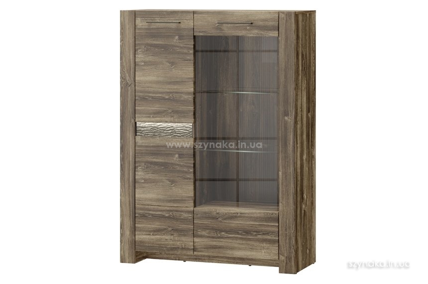 BELVEDER 15 SZYNAKA Витрина двухдверная модульной системы Бельведер ШИНАКА. Декорирована внешней горизонтальной подсвеченной вставкой, имитирующей кору дерева. За правой дверью, оснащенной вставкой из прозрачного стекла, расположены три полки, в том числе две стеклянные. В левом отделении установлены три деревянные полки. Витрина оборудована системой тихого закрытия дверей и дополнительно комплектуется подсветкой 2-L-BC-1-0000-01.